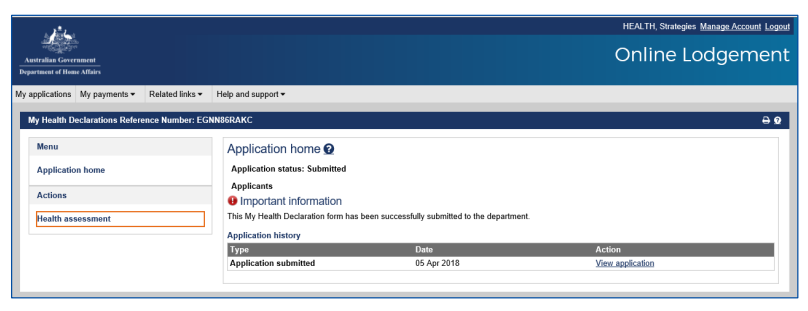 Once you have logged in, click ‘New application’. - Then click the Health -> My Health Declarations option to open a new health declarations wizard.