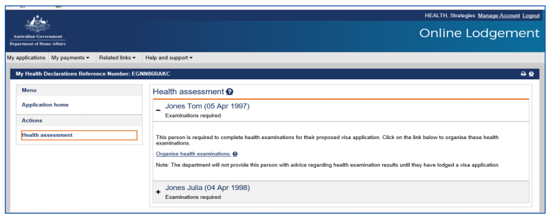 The Organise health examinations link will take you to complete your medical history online and generate a referral letter to complete your immigration health.
