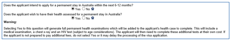 Travel history for HAP ID If you select Yes to question about intentions to apply for the permanent stay in Australia within the next 6-12 months, an additional question will display asking whether you wish to have your health assessed for a permanent stay in Australia, that is complete health examinations for a permanent stay level.