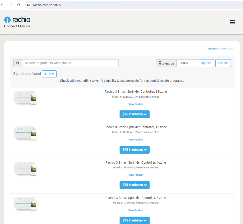 Rachio has a dedicated page for finding the rebate that your city is running for installing smart sprinkler controllers.