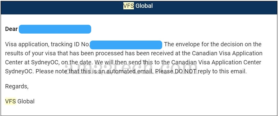 Visa application, tracking ID No. XXXX The envelope for the decision on the results of your visa that has been processed has been received at the Canadian Visa Application Center at SydneyOC, on the date. We will then send this to the Canadian Visa Application Center Sydney OC.