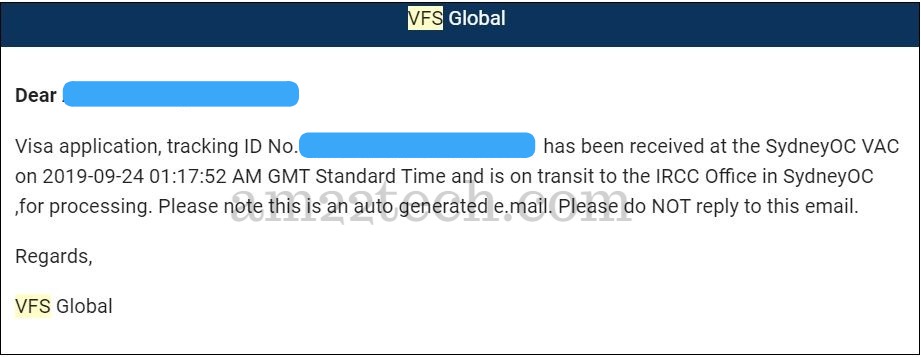 Visa application, tracking ID No. XXXX has been received at the SydneyOC VAC on 2019-10-03 12:11:53 AM GMT Standard Time and is on transit to the IRCC Office in SydneyOC ,for processing. Please note this is an auto generated e.mail. Please do NOT reply to this email.